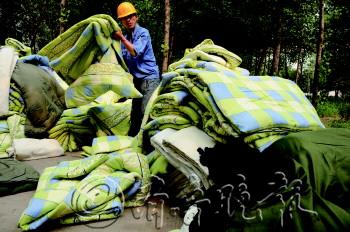 14日,工作人员正在对查处的700件“黑心棉”制品进行集中销毁。这些“黑心棉”制品是今年3月份以来,市质监部门在全市医院、学校、幼儿园、宾馆等地查处的,市质监部门建议市民谨慎选购,同时向社会公布举报电话:0533-2302267、12365。 本报记者 姜文洁 摄影报道