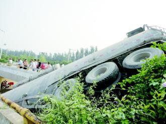 | 大罐车轧过绿化带,从立交桥上栽了下去。 本报记者 甘倩茹 本报见习记者 殷悦 摄 |