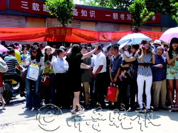 | 2013年7月12日,山师附中考点,工作人员竭力劝家长后退。中考不仅仅是在考学生,家长心里比孩子还忐忑不安。(资料片) 本报记者 李飞 摄 |
