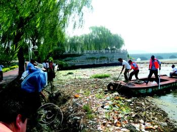 近日的连续降雨后,从上游冲进长清湖许多垃圾,园博园工作人员顶着烈日清理湖中垃圾。 见习记者 贾文圆 摄