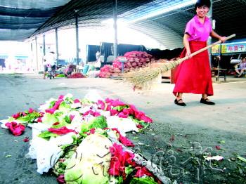 | 济宁蔬菜批发市场,经营户正在清理烂掉的蔬菜。 庄子帆 摄 |