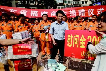 16日,济南街头街心花园内,山东省福建商会的代表们将价值一万五千元的茶叶、毛巾、药品等防暑用品和两万元现金捐赠给济南趵突环卫所,为环卫工人送去清凉。 本报记者 左庆 摄