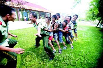 | 16日,武警战士们带着儿童村的孩子一起做游戏。 本报记者 李泊静 摄 |