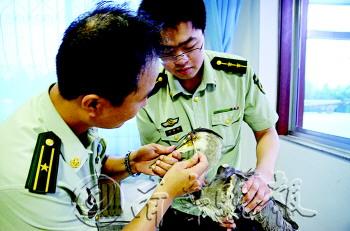 本报8月16日讯(记者 于飞 通讯员 刘青嵩) 15日下午,牟平区姜格庄镇一位村民在汉河河边看到一只受伤的大鸟,担心这只大鸟因伤难觅食,村民赶紧报了警,姜格庄边防派出所的民警将这只大鸟带回所里医治。经过专家指导,民警才知道这只大鸟是苍鹭,属于省级保护动物。 姜格庄边防派出所民警接警后,赶到河边把受伤的大鸟带回了所里。民警刘有琦拿来药品给大鸟擦了药。“上了药,我怕它饿,就找来一些水果、蔬菜、鸡蛋放在它面前。想到它当着我们的面不敢吃,我们还特意回避了,隔了一段时间再去看,它什么都没吃。”刘有琦说,为了保险起见,他们找来林业局的专家。 牟平区林业局森保站站长常宗涛看到这只大鸟后,说这是一只苍鹭,属于省级保护动物,一般生活在湿地滩涂,出现在汉河河边也不稀奇。“苍鹭属于一种水鸟,通常以鱼虾、青蛙为食。”刘有琦听完赶紧到厨房找来一些扇贝喂给苍鹭。 常宗涛说,苍鹭的眼睛发生了病变,肯定影响到正常觅食,但是要人工喂养,也不是长久之计,因为它在受惊后不会轻易进食。最后民警听从专家建议,将苍鹭送到了专门的动物保护部门进行治疗。