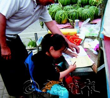 作品描述:父亲一边路边卖西瓜,一边辅导孩子做作业,两不误呀。