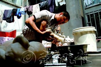 |  | ▲制作石膏娃娃是个耐心活,刘祥杰脸上冒出汗珠。