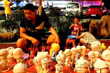 ◥刘祥杰看着自己夜市上的石膏娃娃显得有些惆怅。