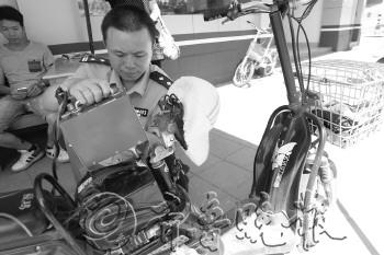 | 民警正在为电动车打码,这相当于上了一道防盗险。