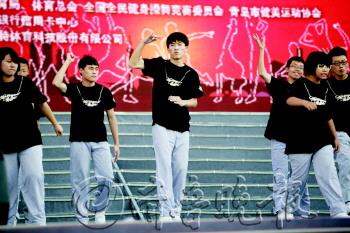 20日,在啤酒节中心舞台,来自青岛KM嘻哈达人街舞馆的舞者表演街舞。当天,由国家体育总局推动的2013全国全民健身操(舞)大赛青岛分站赛完美落幕,包括时尚健身操舞、时尚健身课程、街舞、广场健身操舞和民族健身操舞五大类六个组别,吸引了岛城40多支代表队参赛。