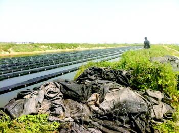 | ◥莱州一处养殖池塘,因海参损失较大,防晒网被扯到了岸上。 本报记者 李娜 摄 |