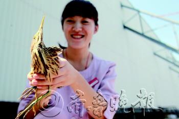 本报热线6610123消息(见习记者 蒋大伟) 21日,市民李女士拨打本报热线反映,她捡到一只漂亮小鸟,但是鸟受伤了,不能飞行,也不愿吃食,希望可以帮帮这只鸟。记者随后联系到南山公园,工作人员称它是黄苇鳽(jiān),已经收留在动物园内悉心照顾,治愈好后将会把它放归自然。 21日下午,记者来到位于南大街上的李女士的工作单位,见到了这只可爱的小家伙。“20日早上上班时,我在楼上的大平台上发现了它,当时它一动不动,开始还以为是只假鸟,走进发现它在动,大家也不知道它是什么鸟。” 李女士和同事当时试图将这只鸟放飞,但是鸟好像受伤了,飞不起来。随后他们将这只鸟暂时收留,给它喂了小米和水。 “我们给它喂食它不吃,无奈之下,我们就将食物放到它嘴里,它勉强吃了点,今天精神似乎好了点,但我们担心养不活它,希望通过你们将它送到野生动物救助站。”李女士的同事说。 随后记者联系到南山公园动物园的工作人员,工作人员称可以将小鸟送到南山公园的陆生野生动物救助站,“希望你能快快好起来,回归大自然。”临别时,李女士恋恋不舍地将鸟送到记者手里。 南山公园动物园的兽医姜春林对这只鸟进行了简单检查,通过外形确定是黄苇鳽,属于鹭科苇鳽属,俗名水骆驼、小老等,是一种中型涉禽,栖息于湖、江河、沼泽地等地方,属于国家二级保护动物。这只鸟可能翅膀受伤了,黄苇鳽主要以小鱼等小活物为食,比较难喂养,都是野外生存。“我们将单独对其照看,等它伤好后将放归大自然。” 姜春林介绍,南山公园设有陆生野生动物园救助站,像黄苇鳽这样的鸟每年都会有很多送到救助站,“黄苇鳽这个品种一年有10只左右被送来救助站,现在救助站救助的野生动物90%都是野生鸟类。”姜春林提醒市民,野生鸟类不好饲养,市民又不熟悉有些鸟类的习性,碰到野生鸟类最好放归自然或者送到野生动物救助站。在接触野生鸟类时要注意安全,避免被鸟类啄伤或者抓伤。