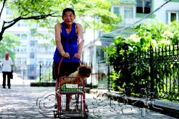 | 21日,丁天一老人像往常一样用小车推着“小发”遛弯。 本报记者 高绪亮 摄 |