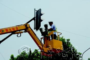 8月4日,星期日,天气湿闷。日照交警东港大队设施科民警不畏酷暑,及时对辖区内突然损坏的红绿灯进行维修,并对部分温馨提示标牌进行更换,赢得了群众的好评。