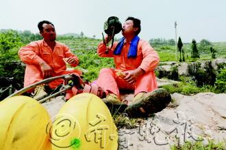 时间:2013年7月7日 地点:山亭区 自述:枣庄供电公司党员服务队,顶着烈日翻山越岭,来到山亭区曹山顶村维修线路,一壶清水一个煎饼卷大葱就是他们的午餐。 作者:孙琦