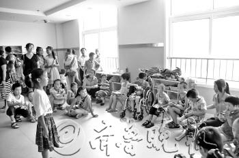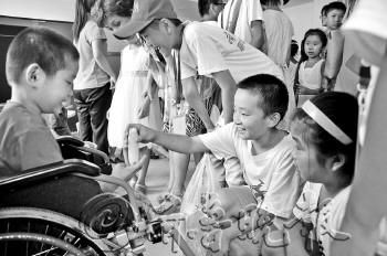 | 小报童们把自己买的礼物交给福娃。 本报记者 邹俊美 摄 |  | 小报童们为福利院的孩子们表演节目。 本报记者 邹俊美 摄