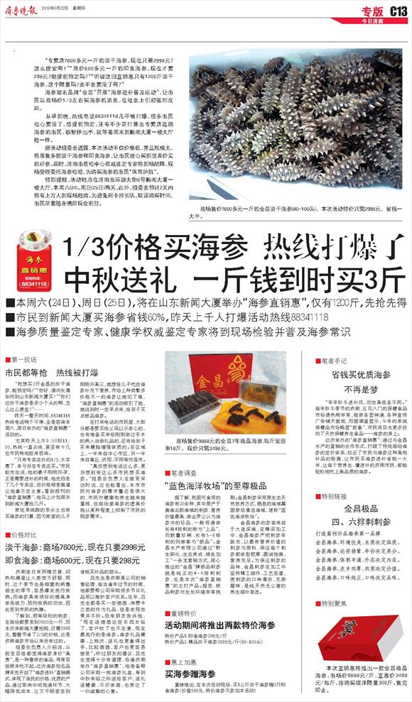 1/3价格买海参 热线打爆了 中秋送礼 一斤钱到时买3斤■本周六(24日)、周日(25日),将在山东新闻大厦举办“海参直销惠”,仅有1200斤,先抢先得■市民到新闻大厦买海参省钱60%,昨天上千人打爆活动热线88341118■海参质量鉴定专家、健康学权威鉴定专家将到现场检验并普及海参常识