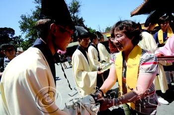 22日,利群阳光活动主办方代表马秋莲给阳光学子发成人证书。当日,2013年利群阳光助学行动在曲阜孔庙举行助学金发放暨阳光学子“成人礼”仪式。