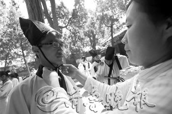 庄严声乐响起 学子进入状态 祭孔大典是华夏民族为了纪念先师孔子举行的隆重祀典,持续两千多年从未间断。为让这一场仪式更显庄重,曲阜方面特意准备了汉服,帮助学子们尽快进入“角色”。 在孔庙大成门外,听说要穿汉服参加祭孔大典和“成人礼”,学子们一下欢呼雀跃起来。不过真正试穿汉服时他们才发现,单单是汉服的穿戴,已经是“一招一式皆学问”。 学子朱秀文把古代儒生戴的帽子一把戴到头上,却不知帽子缝是要向后的。汉服交领、右衽,需要先系里边的绳带再系外面;衣服穿上了,却没有电视上那般潇洒自如……最后在工作人员手把手教授下,学子们才一一穿上汉服。很快,上午11:00,祭孔大典正式启幕,刚才还雀跃着的学子们在庄严悠长的声乐里立刻进入状态。