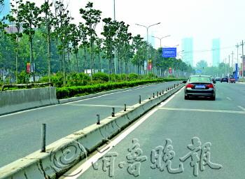 | 22日,济南工业北路黄台电厂段,北侧的BRT车道护栏已经被拆除了2公里左右。 本报记者 周青先 摄 |  | 22日,工业北路部分路段,BRT护栏底座还在路上。