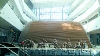 | 图书馆内的报告厅造型独特,工人们正在进行紧张施工。 本报记者 陈伟 摄 |