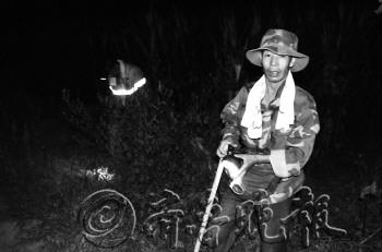 每年的这个季节,男女老少都捉蛐蛐 抓蛐蛐,村民们全副武装。李岩松 摄 穿着长裤长褂,戴着帽子,脖子上搭条毛巾,检查矿灯是否够亮,将装蛐蛐的腰包挂在身上,拿着一把木枪,晚上7点左右,颜世河骑着摩托车出发了。从家里到地头用了十多分钟的时间,把摩托车停在路边,钻到玉米地的深处,蛐蛐的鸣叫越来越响,此起彼伏,像在演奏着一场交响乐。 “这把枪一是用来防身,另外就是把蛐蛐从窝里挖出来,是必不可少的工具。”颜世河说,玉米地里很扎人,不管多热,都得穿着厚厚的长裤长褂,前几天闷热,搭在脖子上的毛巾一拧就哗哗向下滴水。腰包里装了七八个小罐子,把捉到的蛐蛐装到罐子里,用皮筋扎好再放回包里,一天能抓十多个比较好的蛐蛐。 头大、牙大、“斗丝”细长、尾巴细长、腿脚有力的蛐蛐是好蛐蛐,捉蛐蛐的时间长了,不用看这些特征,听鸣叫就能知道蛐蛐好坏。“蛐蛐的叫声是由翅膀摩擦发生的声音,越是小的蛐蛐叫的频率越高,真正大个的蛐蛐一晚上叫不了几声,因为翅膀太重了。”颜世河告诉记者,如果一块地里只有一只蛐蛐在叫,说明这只蛐蛐是斗士”,把其他蛐蛐都斗跑了,叫声响亮时间也长。 颜世河今年52岁,捉了二三十年的蛐蛐了。从立秋到秋分这一个多月的时间内,颜世河每天早晨6点就去地里捉蛐蛐了,10点左右回家,晚上7点左右再钻到地里,晚上10点左右,把当天捉到的蛐蛐拿到镇上的交易市场卖,运气好时,一只蟋蟀能卖三四千。 当天中午,在回家的路上遇到收蛐蛐的商贩,颜世河卖了5只,有的50元、有的100元,其中有一只蛐蛐,颜世河感觉能卖五六百,但商贩只给了200元,颜世河拿回了家,打算在夜市上卖个好价钱。这一个月的时间,颜世河抓蛐蛐的收入能达到两万多元。 颜世河是农民,属于捉蛐蛐的专业户,所在的王家村有390户1500多人,每到这个季节,即使在外打工的也都回家捉蛐蛐。据村民回忆,大约从十七八年前起,蛐蛐可以在市场上交易,村里的男女老少都开始下地捉蛐蛐,很多村民都发家致富了。