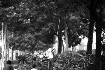 22日,天衢路上,园林工作人员正在修剪路边树木的枝叶,以保持良好的树形姿态。