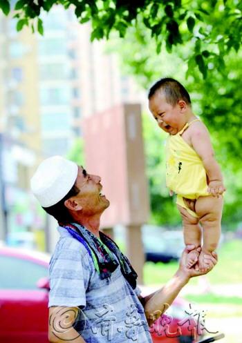 自述:将孩子托在手中逗乐。