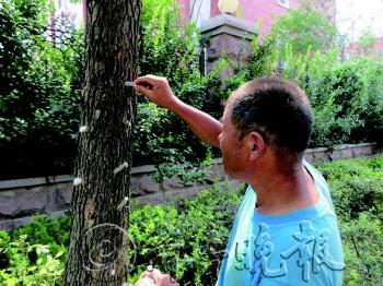 8月21日,渤海十七-1路国槐树上插满了套有玻璃试管的铁钉,试管里装满了“管氏肿腿蜂”虫卵,这是滨州园林采用生物防治天牛类蛀干害虫的新方法。目前,放蜂工作还在进行,将陆续对受天牛危害路段进行释放。