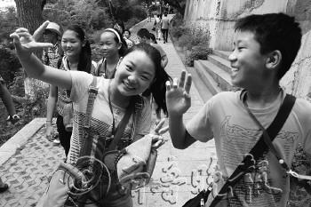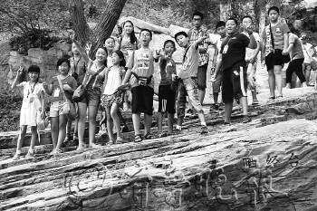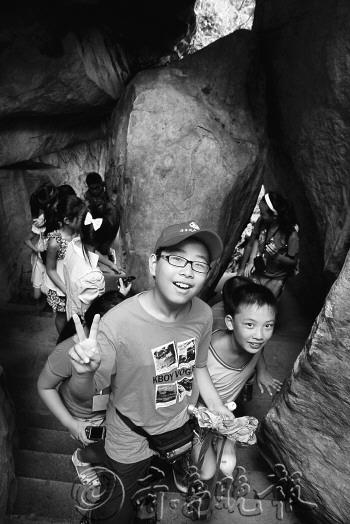 8月22日上午,参加齐鲁晚报暑期夏令营的孩子们乘车来到花果山,坐了20多分钟的盘山车,来到了群山中的水帘洞。 下车后,映入眼前的是各种形象的石头,有唐僧、猪八戒、孙悟空、哮天犬等栩栩如生,孩子们纷纷拿出相机拍下来,回去后给好朋友欣赏。经过20多分钟的欣赏,孩子们来到了晒经石上,这里传说是唐僧晒经书的地方,孩子们爬上去,寻找是否有经文存在,并在上面合影留念。由此往山上去,来到了水帘洞的前门,走入漆黑的洞内,摸索前行,经过十几分钟来到后门,后门被瀑布盖住,只能从水中穿过,孩子们身上都湿了,却十分开心,门前树上猴子正在吃东西,孩子们大声尖叫,跑上前去拍照,拿东西喂猴子。 “真好玩,下次我还来,还走水帘洞,给猴子喂东西。”李筱越说,在山上孩子给弟弟买了一根孙悟空的金箍棒,给妈妈、姥姥也买了别的礼物。《西游记》发祥地花果山是国家AAAA级风景区,有孙悟空的诞生地娲遗石、根据地水帘洞、惟妙惟肖的怪石园,吴承恩就是取材于此,创作了中国著名的古典神话小说《西游记》。 吃过午饭,结束了夏令营的旅途,孩子们坐车回到聊城,在车上孩子们商量着下次还要一起去玩。有些疲惫,更多是快乐、高兴。