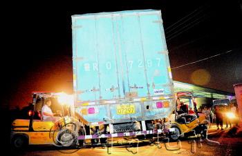 | ◥23日晚,工人用两辆小型叉车转移堵在快递公司门口的货车。