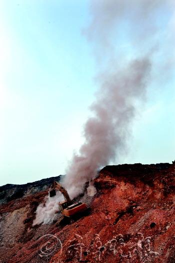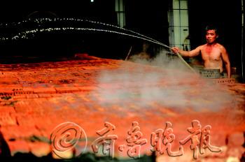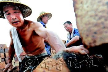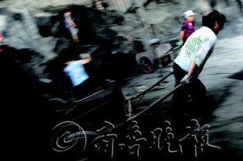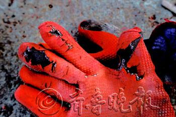 | ▲搬运工们被热砖烤得汗流浃背。 |  | ◤堆积了几十年的矸石山终将成为历史。 |  | ▲一名女工将已经尘化的煤矸石粉运出厂房。 |  | ▲有时搬运工一副新手套用不了一天就被高温方砖烫坏。 |  | ▲出炉的窑车经过一天一夜后温度依然很高,需要洒水降温。 |