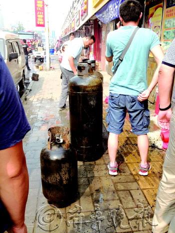 | 火灾中,四个被消防队员转移出放置在门口的煤气罐险成炸弹。 实习生 延宝蕙 摄 |