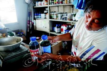 | 23日下午,在黄务市场一农药店内,店主向记者展示销售的百草枯。 本报记者 王永军 摄 |