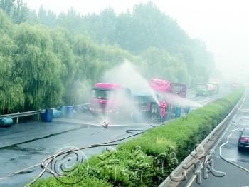 本报泰安8月24日讯(记者 刘来) 23日22时30分许,泰新高速泰安东上道口东5公里处,一辆拉着24吨邻氯氯苄化工原料的货车与前方一辆拉电缆的大货追尾,后车司机当场死亡,车上邻氯氯苄发生部分泄漏。由于该化工原料有中等毒性,泰安市出动27辆消防车122名消防队员赶赴现场救援,经过12个小时的洒水稀释,终于将事故现场泄漏的邻氯氯苄全部处理完。 23日23时30分,记者赶到泰新高速泰安东上道口附近看到,十多辆消防车已经赶到现场,并且不断有消防车闪着警灯赶到。在距离事故现场不到2公里的位置,记者就能闻到空气中有刺激性气味,并感到眼睛酸痛想流泪。由于事故现场气味浓烈,救援人员也设置了警戒线。 24日5时30分,记者再次来到事故现场。此时空气中的刺激气味已经减弱很多,前面的临沂牌照大货车上拉的是电缆,后面的安徽牌照大货车上是装着邻氯氯苄液体的蓝色塑料桶。由于撞击猛烈,前车车尾几乎伸进后车驾驶室内。 安徽牌照大货车上装载有邻氯氯苄24吨,撞击造成部分泄漏。据介绍,该化工原料有中等毒性,对眼、黏膜有刺激性,能催泪。操作时避免与人体直接接触,设备必须密闭。消防部门在距现场上风方向200米、下风方向1000米处设置警戒。救援队员穿着防化服,佩戴空气呼吸器,利用水枪不断往车身和周边打水稀释。由于稀释需要大量的水,消防车不断前往市区加水再返回。直到24日11时30分左右,终于将泄漏的液体稀释完。 据了解,该事故造成后车司机当场死亡,另外有3人吸入有害气体身体不适,被120急救车拉往医院,3人均没有生命危险。目前事故原因仍在调查中。