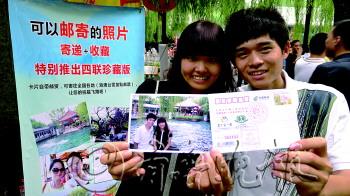 | 游客拿着印有照片的明信片。本报记者 周青先 摄 |