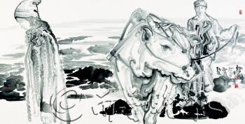 “意笔写真”是赵初凡这批写意新作的艺术主张。在他看来:仅仅以简练之笔勾勒景物的神态还远远不够,他从写实中走来,更倾向于探索写意和写实相互融合这一区间。所以他提出的“意笔写真”的观点,便是期待通过写意来表现物象的真实面貌,并与传统写意区别开来。他提倡用简练之笔来取物象之神,画面整体写意,局部写真,使描写对象具备写意之简练松动,又不乏写实之精巧逼真,给画面带来了独特效果。作品《飞翔》系列,便是赵初凡意笔写真的代表作。在这批作品中,他将远山近景统统简单化,松动随性的笔触中实虚对比,显现了远山的苍茫和天空的浩瀚。上空盘旋的飞鹰眼神犀利,俯瞰大地,浓墨晕染的翅膀厚重有力,羽毛细微,眼睛传神,让写意之作多了写实的形神肖似,也显示了其扎实的造型和描写能力,以及以繁化简的概括能力。
