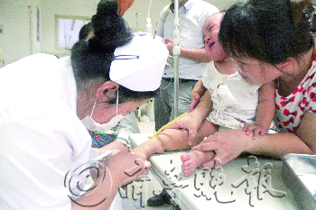 | 25日,毓璜顶医院的护士给幼儿扎针,每次都小心翼翼。 本报记者 韩逸 摄 |