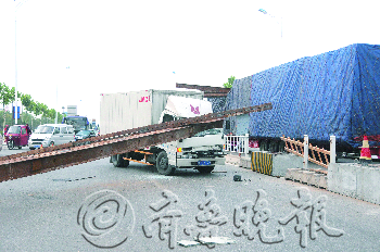 本报热线6610123消息(记者 王永军) 25日早晨4点40分,在澳柯玛大街东方海洋保税库附近,一辆满载冰箱的大货车南向行驶时,不慎撞上附近高架桥设置的横梁,倒下的横梁正好砸中北向行驶的一辆白色厢式货车的驾驶室,幸运的是,两车司机和附近市民都没受伤。 25日早上6点半,记者来到了事发现场。因现场车辆无法通行,自南向北的车辆纷纷选择从附近绕行。一辆罩着蓝色防护布的红色大货车停在马路中间,几根横梁躺在大货车车厢上。在大货车旁边有两根立柱连接着横梁,被大货车拖出去十几米远,大货车后方的3个大型水泥墩也侧翻在地。在货车旁边的北向车道上,一辆白色厢式货车停在路上,两根横梁砸扁了驾驶室,前挡风玻璃碎成了蜘蛛网状。 “事情发生在早上4点40分。”红色大货车的司机王先生告诉记者,他从青岛黄岛往烟台拉货,车上拉的都是冰箱和冰柜。车厢上方货物高度堆放的不是很一致,当时车头顺利地通过了横梁,没想到车体却被卡住了。当时刹车已经来不及了,横梁和立柱就被撞得随车拖出去好远,没想到后果会这么严重,万幸是被砸中车辆的人员没事。 据施工人员介绍,附近正在进行高铁项目建设,在这个路段有一个高架桥,横梁是才安装上去的,限高4.5米,而大货车经交警测量高度为4.7米,没想到刚安装上就被大货车给撞得一塌糊涂。施工人员说,每根横梁的重量接近一吨,如果砸中市民,后果不堪设想。 随后,在吊车的作用下,砸在白色厢式货车上的横梁被成功取下,驾驶室的框架也被重新拉伸。工作人员爬上大货车,把连在一起的横梁和立柱切割开。上午8点,横梁和立柱被成功吊离后,大货车和厢式货车都停到路旁,现场的交通恢复畅通。 奖励线索人姜女士50元 万幸>> 天降横梁,幸好白色厢货司机毫发无损 在白色厢式货车旁边,记者见到了驾驶员孙先生,他正忙着收拾货车驾驶室内的物品。孙先生把碎成网状的前挡风玻璃整个一块扔到地上,坐进驾驶室,把车开到了马路旁边。 “简直是天降横梁呀。”孙先生说,当时他驾车正常往前走,没有任何征兆,结果天降横梁正好砸在他车上,还好他当时下意识地往后躲了一下,等他回过神来,整个驾驶室已经被砸扁了。 孙先生说,他仔细查看发现自己并没有受伤,就是感觉那一瞬间太吓人了,还好货物也没遭受到损失。上午7点半左右,货车上的货物被卸到另外两辆车上,孙先生这才如释重负地舒了一口气。 孙先生告诉记者,这次终于体验到什么是有惊无险了,还好自己没事,不然家里人不知道该多着急呢。 损失>> 四个水泥墩掀翻了仨,维修得花不少钱 承载横梁的立柱安装在大型水泥墩上,在大货车的撞击下,一溜四个水泥墩被掀翻了三个,侧翻在地。 “能把水泥墩带翻,可见大货车当时的撞击力有多大。”现场施工人员说,这些横梁当时焊接时费了不少事。现场施工人员告诉记者,近一吨的横梁被撞后虽然都还能用,但要想把它们再安装上去可得费不少钱。这名工作人员说,维修必须得出动吊车,整个焊接和人工费用要好几万。现在等交警和保险公司勘查完现场后,还要等待有关部门定损,才能最终确定维修费用。 探访>> 市区限高杆多在4.3-4.5米,车辆通行需注意 25日中午,记者对市区内一些主要的铁路桥进行了探访,发现限高杆的高度多在4.3-4.5米之间。在北马路和青年路路口北侧的铁路桥,入口处和出口处限高杆上写着“限高4.3米”,铁路桥桥体上写着“限高4.5米”。芝罘屯路上的铁路桥洞和北马路的限高完全一致。幸福南路车管所附近铁路桥限高杆的高度是4.5米,红旗西路107医院附近铁路桥的限高杆高度则是4.4米。 一名交警告诉记者,为了保证铁路桥的安全,入口处的限高高度会低一些,这样即使出现意外,也能及时发现问题,不至于卡在桥下。“很多大货车堆放货物太高,加上不熟悉道路情况,很容易发生限高杆被撞的事情。”交警说,车辆经过这些限高杆时一定要注意自己车体的高度,合理安排行车路线。本报记者 王永军