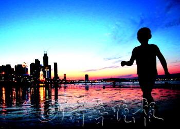 24日傍晚,在第一海水浴场,一位小朋友在沙滩上奔跑,夕阳余晖和沙滩、楼群组合成一幅美丽动人的画面。 本报记者 高绪亮 摄影报道