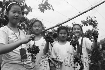 23日,本报小记者走进大泽山葡萄园分享采摘欢乐。学习葡萄栽培知识、采摘葡萄、品尝农家小吃、观赏田园风光,小记者和家长们玩的不亦乐乎。 游大泽山葡萄园 经过2个多小时的行程,我们一起坐大巴车到采摘园。大家刚进葡萄园,就看见了大理石桌上摆放的葡萄,好诱人啊!因为外面很热,所以小同学们一进去就大吃起来。紫红色的葡萄吃起来真过瘾,忽然感觉整个葡萄园就是自己家的一样。看到那么多小同学开怀大吃的样子,我想要是我家也有这么大一个葡萄园该多好啊!那样,我会用我亲手种植的葡萄招待同学和朋友。 葡萄园里种的葡萄品种不同,有粒大的,有粒小的。听老师说,那种粒小的,叫玫瑰香。我们刚才品尝过的葡萄里就有玫瑰香,确实很香很甜。 吃完了葡萄,就到了我们采摘葡萄的时间了。我发现整串葡萄外面都用纸袋包着,纸袋下方有个口,从露着的口那里看看里面的葡萄成熟得怎么样,如果成熟得好,就用剪刀把葡萄茎剪断。同学们兴高采烈地采摘了一阵子葡萄,收获了不少劳动果实。虽然很热,但是大家都开心极了。 本报小记者 赵子竣
