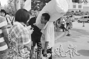 | 一名新生领到了爱心大礼包。 李珍梅 摄 |  | 24日,一名海大新生正在贴一张驶往未来的“火车票”,始发站是中国海洋大学,通往的目的地任意发挥。 李珍梅 摄 |  | 因为心疼孩子,一名父亲肩上扛着一大袋行李。 李珍梅 摄 |