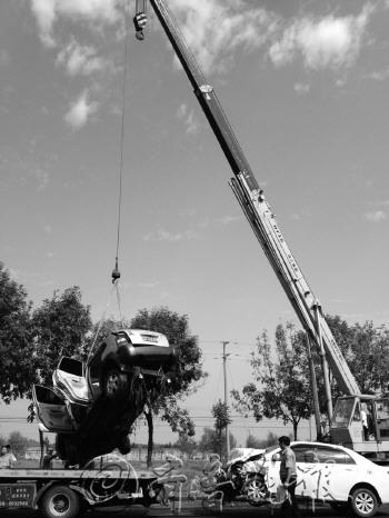 25日上午九点半左右,在滨城区至沾化县的省道S312上,一辆白色比亚迪和一辆灰色现代车相撞,灰色的现代车被撞入附近的沟渠内。据周围目击者介绍,两辆车驾驶室完好。随后赶来处理事故的交警用吊车将现代车吊出。