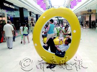 时间:2013年8月15日 自述:室外天气炎热,市民们纷纷来到大型商场休息处避暑乘凉,其中一市民在圈型雕塑里休息。 点评:公共场合注意形象。
