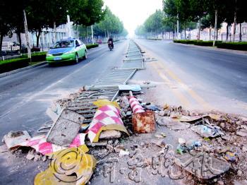 26日早上5点左右,湖滨中大道上,自文化路与东风路中间300多米的护栏,有74段被撞倒,站立的不足10段,也已经被撞错位。 本报记者 孙婷婷 摄