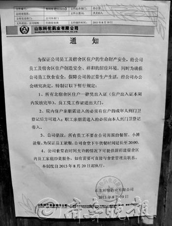 公司新规限制员工 就餐地点引不满 一位不愿透露姓名的市民致电本报称,自己在位于滨州高新区的山东科伦药业有限公司上班,近日公司突然下发通知,其中有一条规定“公司所有员工一律不得在公司周围的餐馆、小摊就餐,一经发现立即开除”。在企业工作遵守企业规章制度本是应该,但吃饭地点的选择仅有公司食堂,这让很多员工不能理解,却是敢怒不敢言。 26日上午11点,记者来到山东科伦药业有限公司,公司附近看起来比较荒凉,少有店铺。公司北门一路之隔的地方就是员工宿舍区,宿舍区门旁设有保卫室,保卫室东面有一家小超市和一家牛肉板面店。快到午饭时间,陆续有员工从企业走出,但却无一人到面店吃饭。面店老板介绍,面店原来主要的客源就是山东科伦药业有限公司的员工,自从公司出台新规定后,店里就少有人光顾了。 记者又来到员工宿舍区内的一家小饭馆,该饭馆同样没有顾客。该饭馆老板娘告诉记者:“在通知没贴出来之前,那个公司办公室牛主任找到店里说要加强宿舍区安全管理让我们停业,我家店各项手续都齐全,凭啥要停业?19号他们就贴出通知不准员工来吃饭,被发现就开除,还让保卫人员负责监督,过了两天又改成了倡议大员工不要来吃饭。” 在宿舍区门前的墙壁上,记者看到了修改后的通知其中第3条写着“公司倡议,所有员工不要在公司周围的餐馆、小摊就餐”。 宿舍区存安全隐患 另类规定属无奈 究竟公司为何要做出这样的规定呢?记者随后来到山东科伦药业有限公司了解情况。公司办公室牛主任解释,公司出台这样的规定也有一番苦衷。原来公司员工宿舍区经常发生外来人员进入与员工打架斗殴事件。就在不久前,就有几个喝醉酒的外来人员到员工宿舍内闹事。 “这宿舍区是我们从滨州市制药厂买过来的,那家开饭馆的是原来制药厂的人,他们本来在外面开餐馆,一年多前把餐馆迁到了宿舍区里,刚开始我们就说过让他们最好只针对公司员工营业,可现在外面来吃饭的越来越多。这给宿舍区的安全造成了很不好的影响。”牛主任说,“宿舍区内本来就不该开餐馆人员进出,很难管理。” 劝说宿舍区内的饭馆停业不成,公司便下通知规定员工一律不准到公司附近餐馆吃饭,否则开除,外来人员进入宿舍区要登记。“通知下发没几天,我们觉得用词有些过于严厉了,所以改成倡议。现在我们没有规定对去那家面馆和饭馆吃饭的员工进行处罚,正在另想解决问题的办法。”牛主任说。
