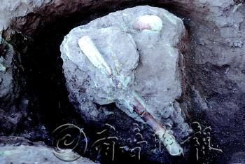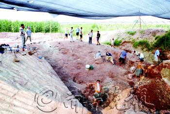 本报烟台8月27日讯(记者 赵金阳 通讯员 董新云) 近日,中国科学院古脊椎动物与古人类研究所科考人员在“中国恐龙之乡”莱阳一处距今约8000万年的白垩纪恐龙化石层,再次发掘出土大量恐龙骨骼化石。 发掘地点位于莱阳市金岗口村东二号恐龙化石遗址保护馆东侧的玉米地中,在已经平整好的面积约40平方米的赭红色土坡上,裸露着20多块大小不一的恐龙骨骼化石,其中最大的一块肱骨化石长60多厘米。“目前大部分发掘出土的恐龙骨骼化石都已经用石膏包裹封存了起来,现已固定石膏包100余件,每个石膏包内含恐龙骨骼化石1至3件,待该区域化石全部发掘完毕后再进行组装和修复。”正在现场进行科考发掘的中科院王强博士告诉记者,为保护好这些出土的恐龙骨骼化石,科考队将化石连同包裹化石的土壤一并用石膏密封,并逐一编号,以备后期的修复和研究使用。 据悉,早在2010年4月,中国科学院古脊椎动物与古人类研究所就与莱阳市成立联合科考队,对吕格庄镇金岗口村西的棘鼻恐龙出土地点和村东北的一处化石地点进行抢救性发掘。为加强对恐龙遗迹的保护,莱阳市分别在金岗口村西和村东北的两处发掘地点建起了恐龙一号馆和恐龙二号馆。 今年7月6日,科考队再次对恐龙二号馆东侧的化石富集带进行保护性发掘。负责该科考项目的中国科学院古脊椎动物与古人类研究所研究员汪筱林告诉记者,目前发掘的恐龙地质带与恐龙二号遗址属同一地质带,在二号遗址附近3平方公里左右的范围内,共发现了十几层恐龙化石和恐龙蛋化石的层面分布,这在其他地方是非常罕见的。不仅如此,根据目前发掘的情况来看,这些化石层面蕴含丰富的恐龙化石和恐龙蛋化石,而且这些地层从早白垩世到晚白垩世都存在,保存也非常完好,对研究恐龙生存演变和地壳运动有着非常重要的价值。