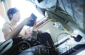 | 一位旅客一边充电一边上网。 本报记者 李泊静 摄 |