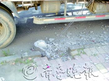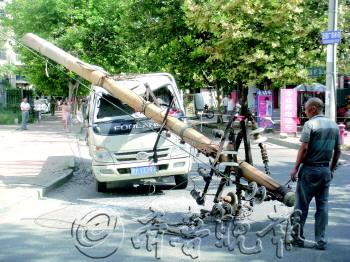 ◤“惹事”的电线杆设在路沿石下的马路上。 本报记者 蒋大伟 摄 |  | ▲被撞倒的电线杆把货车驾驶室砸扁,玻璃碎一地。 本报记者 蒋大伟 摄
