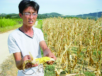 本报8月27日讯(记者 王晏坤 钟建军 李楠楠) 8月份突然由雨转晴,在部分村子,一些庄稼因为干旱而死。27日上午,记者赶往福山区门楼镇东陌堂、西陌堂等地实地探访。 在东陌堂的丘陵耕地区域,山上除种了苹果、桃、葡萄等经济作物外,还种着花生、玉米、地瓜、大豆等农作物,其中很多花生、玉米的叶子因缺水变黄,严重的已经枯萎。 在一片玉米地,田垅头上横七竖八地躺着一些已经枯黄的玉米杆。记者上前看了看,即使是还在站着的玉米,玉米棒子也不算饱满,不少甚至干瘪着。 在西陌堂的耕地,因为缺水灌溉,部分花生叶甚至一捏就碎了。 牟平区莒格庒镇杨家盘村是一个小山村,村里的地都在山上。“山头上种的庄稼,基本上都旱死了。”村民向记者反映,由于庄稼种在山上,离水源地较远,根本无法灌溉,眼睁睁看着辛苦耕种的庄稼旱死在地里,却没有办法。 “今年8月份太旱了。”村民们说,他们初步估计,村里的庄稼今年能减产三成。 在福山区门楼镇西陌堂村,今年76岁的老汉鹿贤均正在摆摊卖地瓜、玉米、梨等农产品,提到今年的收成,鹿贤均直摇头。 “这还谈什么产量?3米多长的一垄地瓜秧,就刨了这么几个小地瓜,这要在平常刨个四五十斤不成问题。”鹿贤均指着摊位说,“在风调雨顺的年份,一亩地能产花生500斤,可根据现在的旱情看,能到350斤就是烧高香了。”