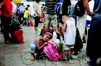 27日,疲惫的孩子在候车。今年暑运接近尾声,德州火车站日发送旅客依然保持在万人次以上。 本报记者 马志勇 摄